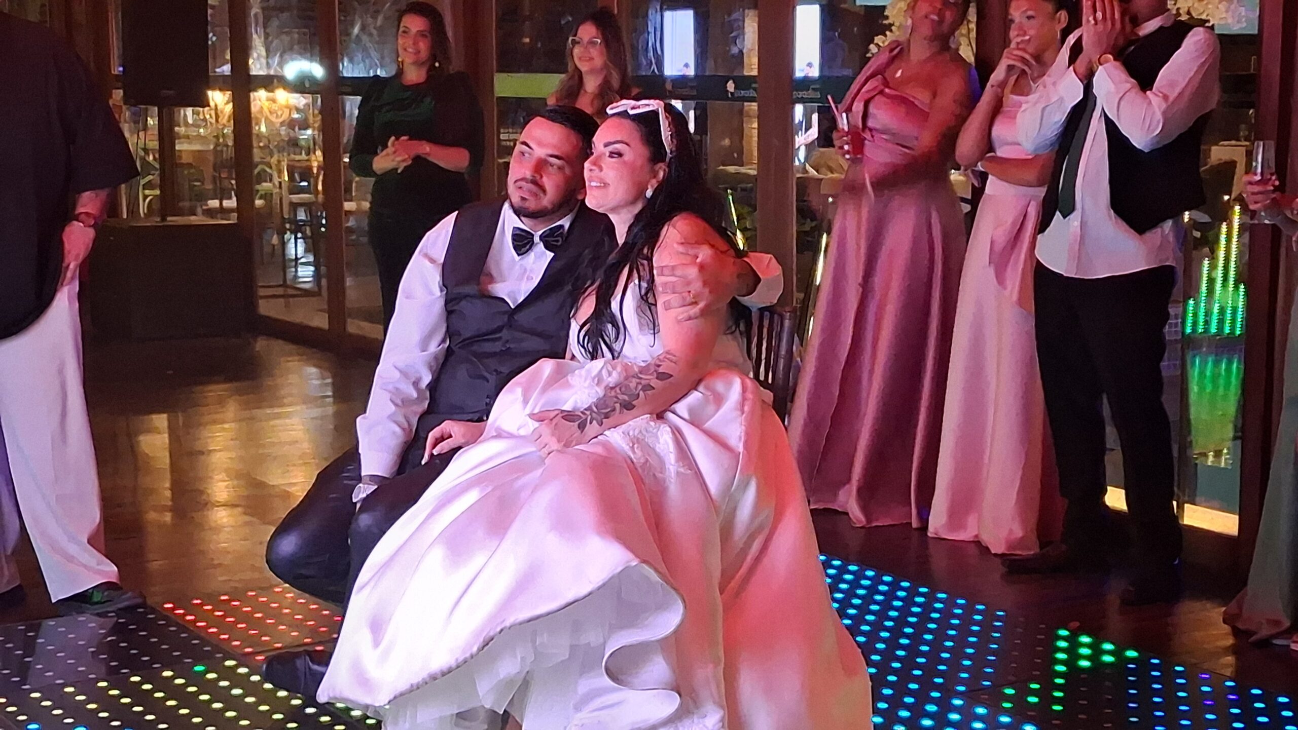 O buquê foi parar nas mãos da influencer Debora Barreto, esposa do cantor Tonzão. E a cena seguinte foi de filme: Tonzão se ajoelhou e oficializou o pedido de casamento, arrancando gritos e aplausos do público.